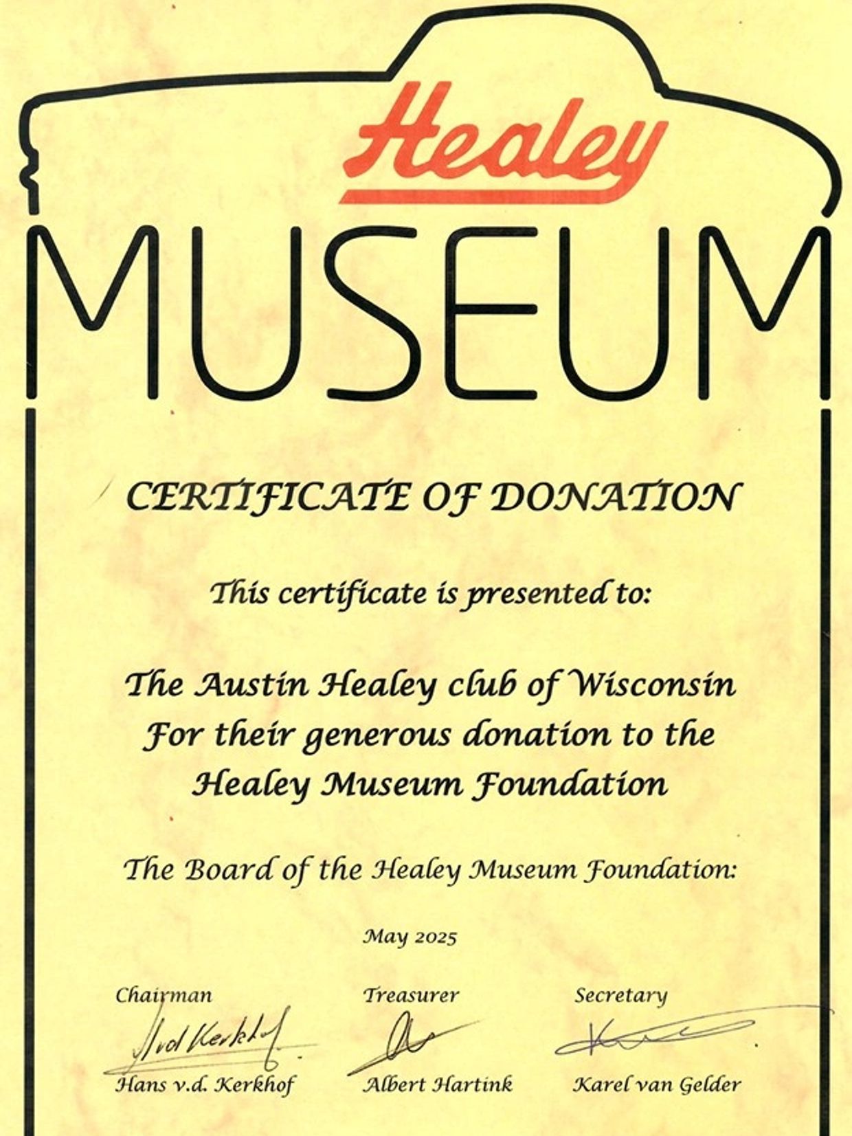 Along with many of the other local clubs, the officers of the Wisconsin Chapter have agreed to pledge a five-year commitment to the museum in the form of a $100 per year donation to help ensure that the museum continues to prosper. As a form of thanks, the museum organizers sent us this certificate. The museum is also offering free admission to the museum for any Wisconsin Chapter members that would like to visit. Several of our members have already paid a visit to the museum and were very impressed with the facility. Visit www.healeymuseum.nl/en/ for more information about the museum.